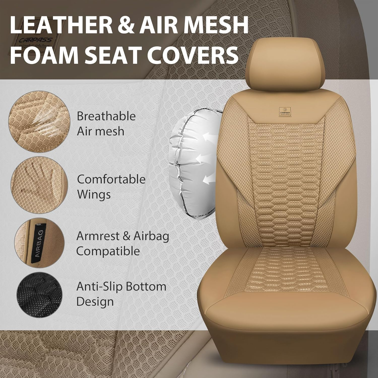 CAR PASS 3D Foam Mesh Leather Car Seat Covers Full Set, Tan Breathable Mesh Faux Leather Seat Covers for Car, Universal Fit for SUV Truck Sedan Automotive, Armrest Airbag Compatible, All Beige
