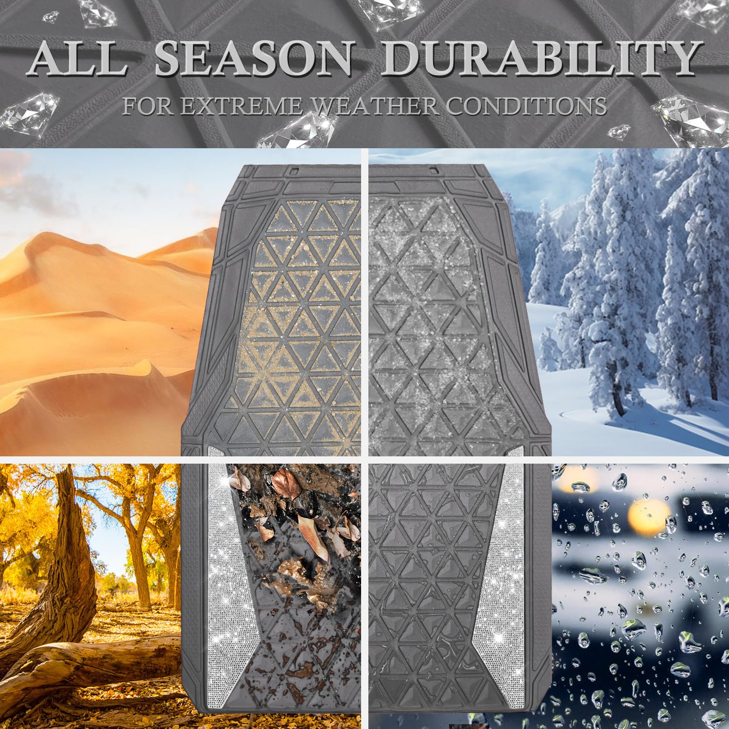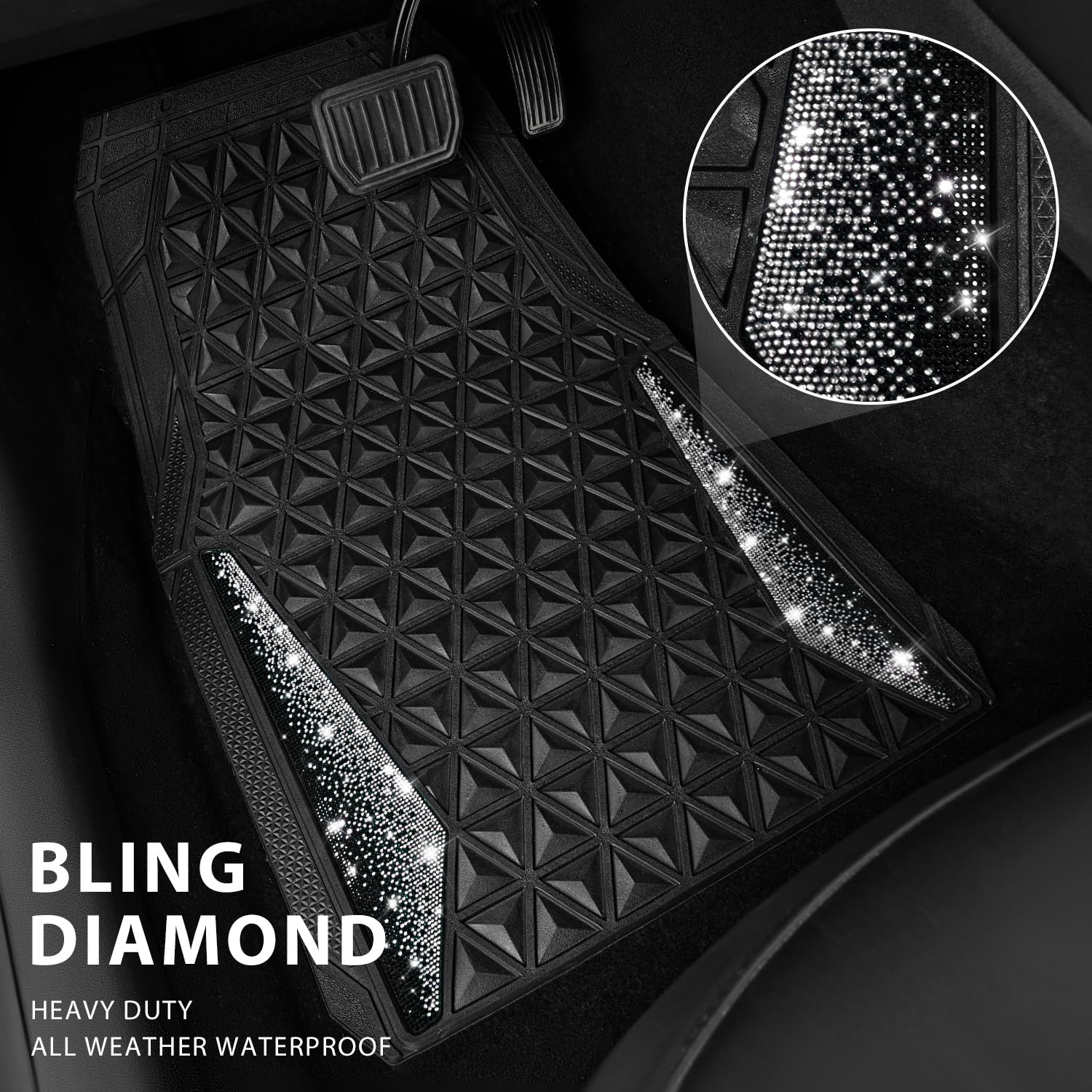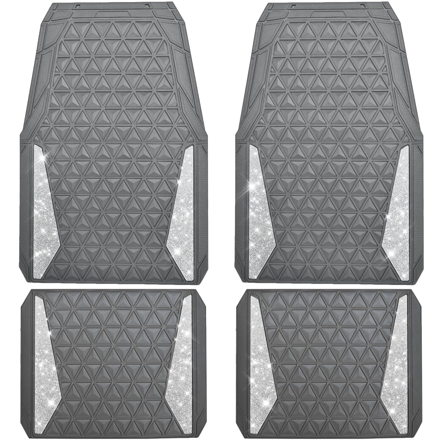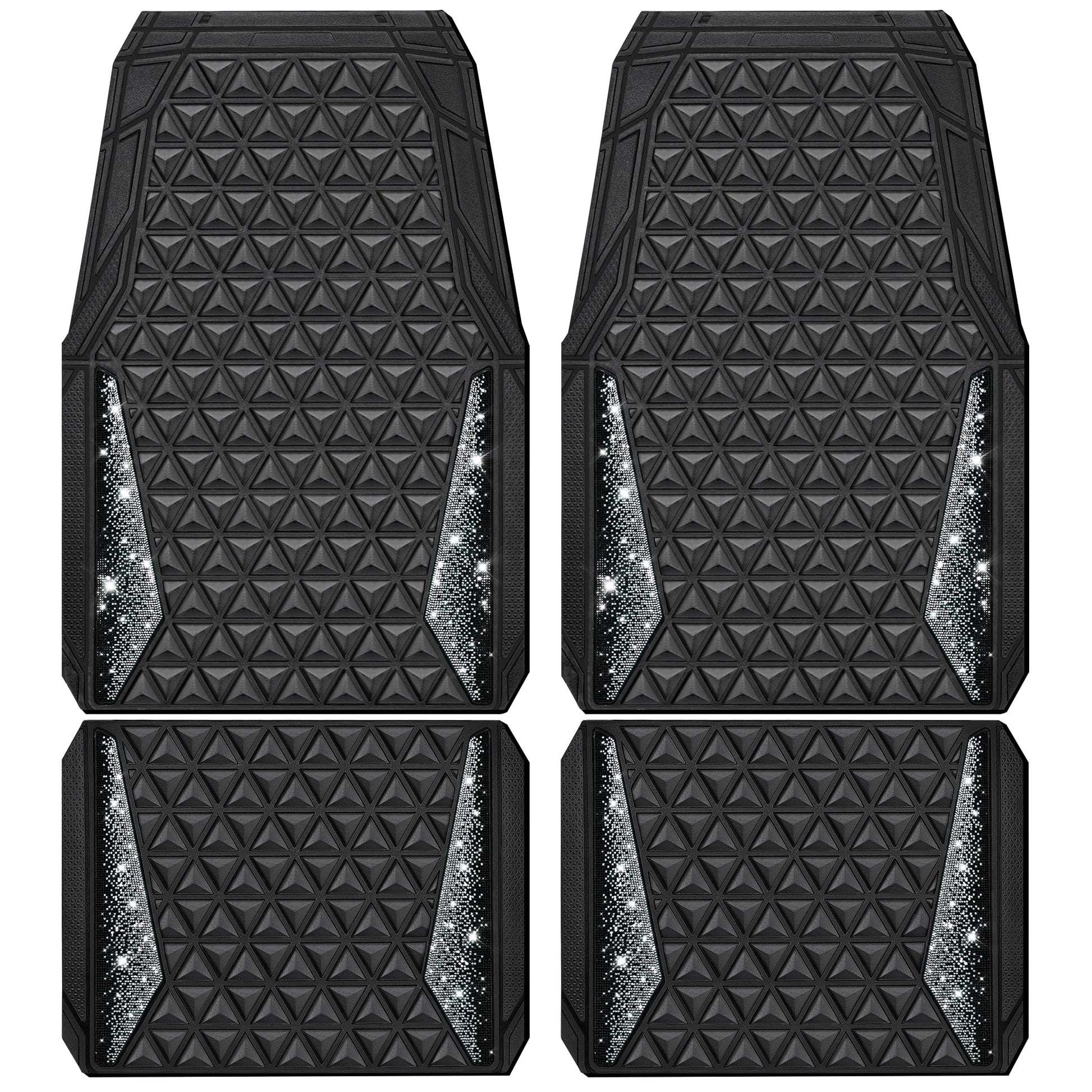 CAR PASS Bling Car Mats Diamond Rubber Floor Mats Full Set Anti-Slip 3D Rhombus Waterproof Trim to Fit Liner Universal Glitter Crystal Sparkly Shining Rhinestone Girl Women SUV Sedan Van, Black Silver