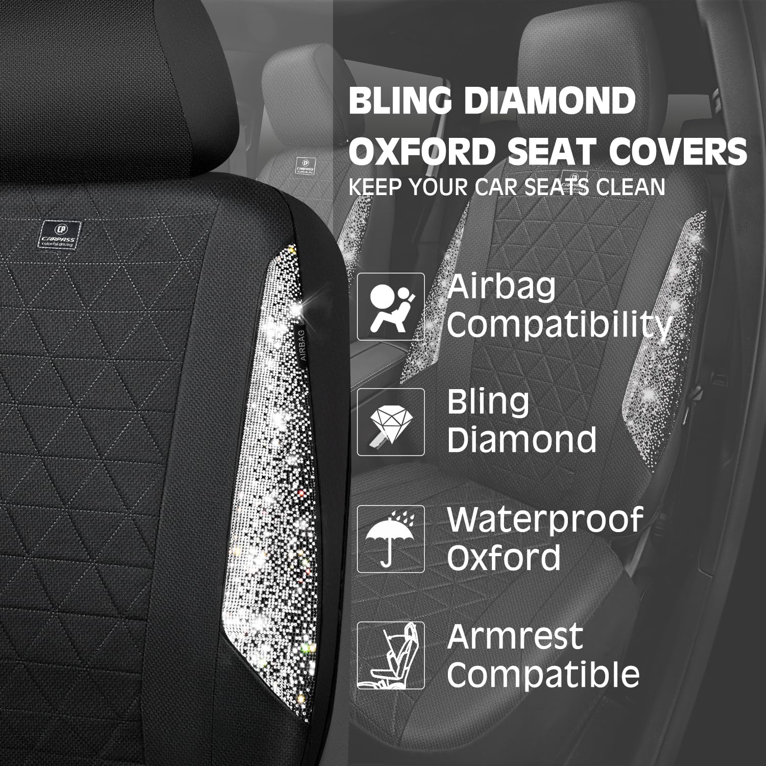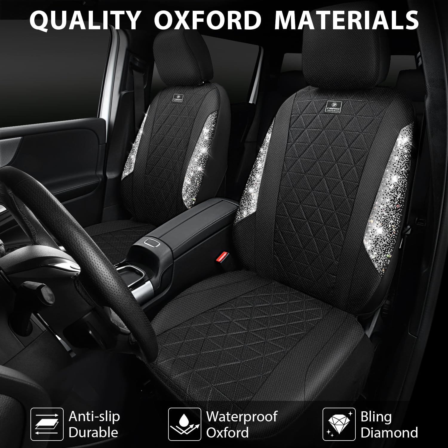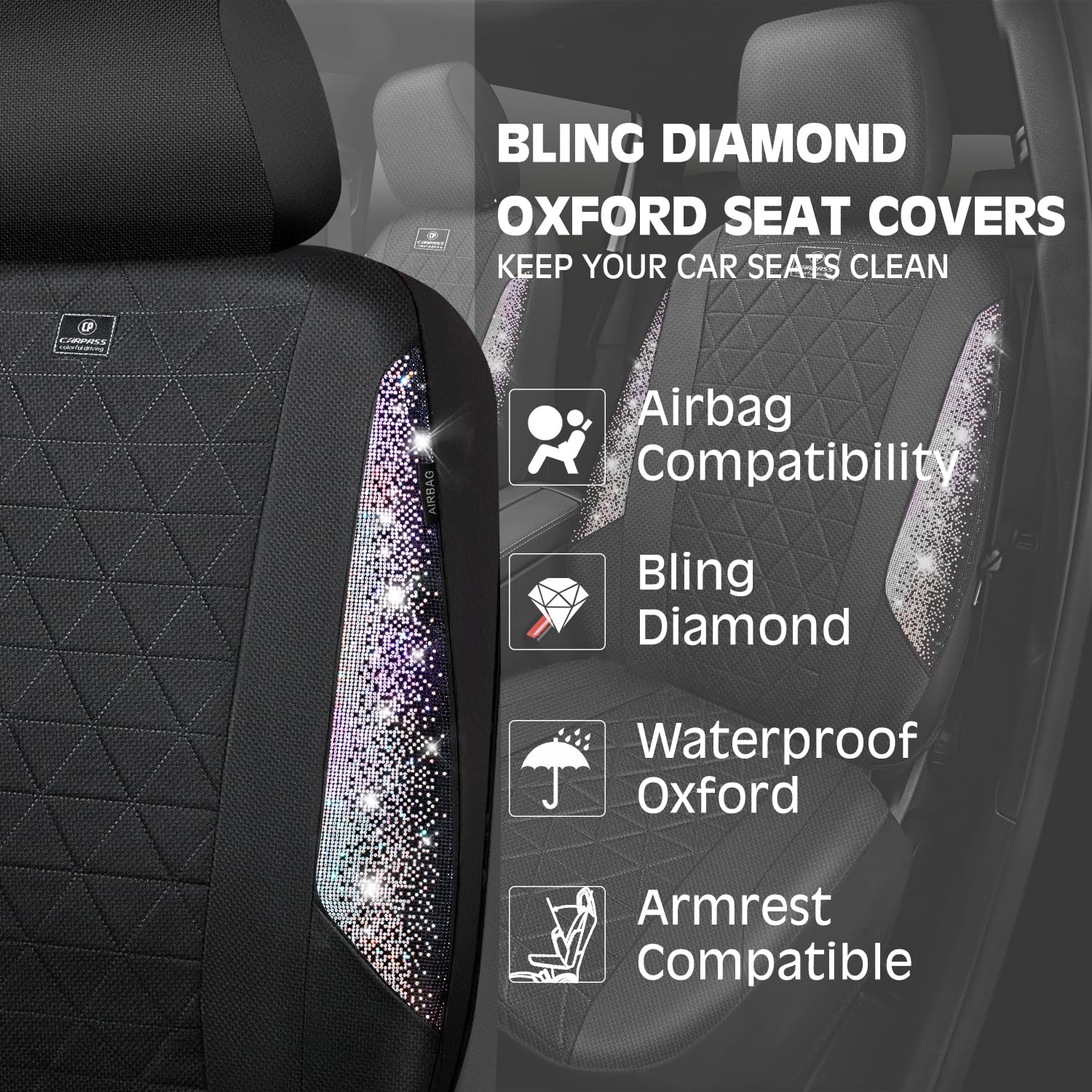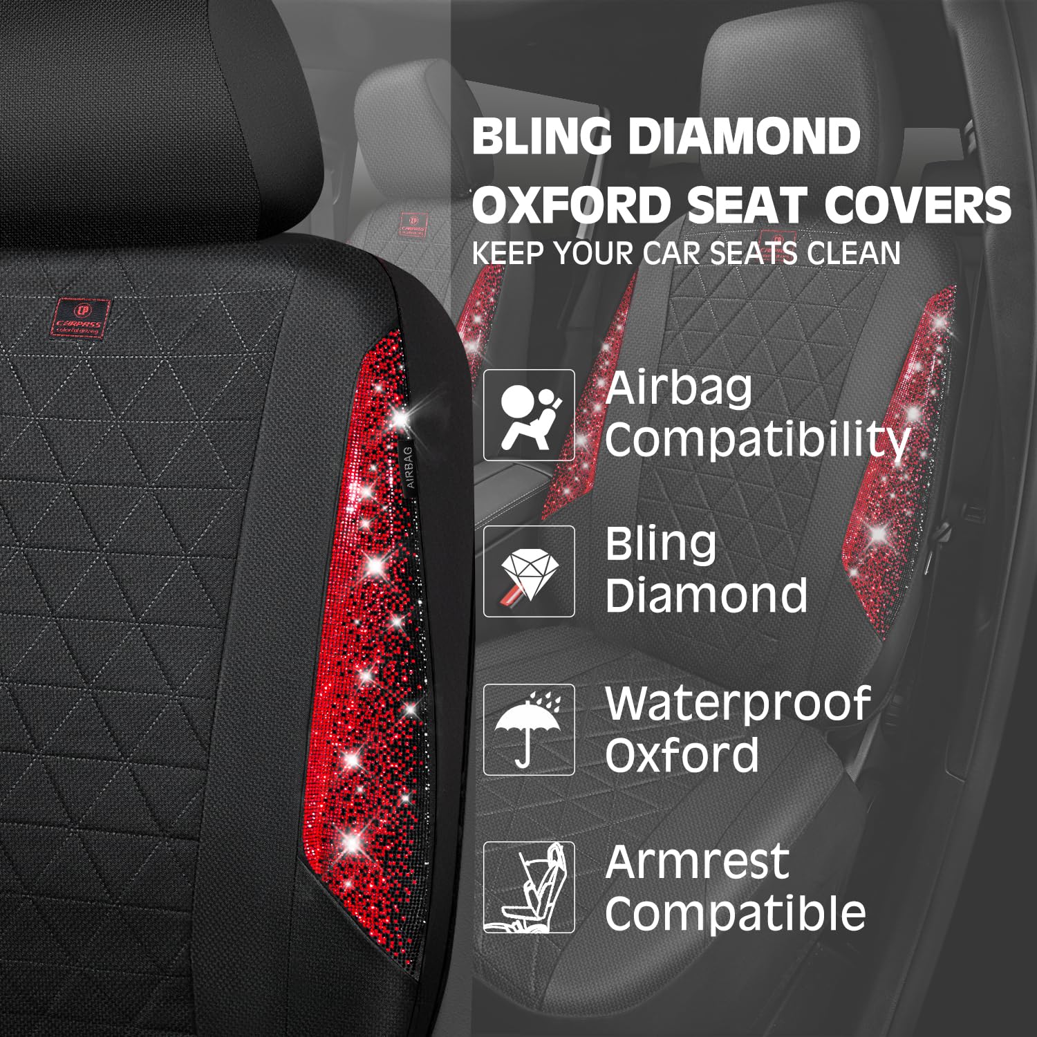 CAR PASS Oxford Bling Diamond Car Seat Covers 2 Front Interior Sets, Waterproof Shining Glitter Sparkly Crystal Universal Armrest Fit 95% Automotive Truck SUV Cute Women Girl, Black Red Rhinestone